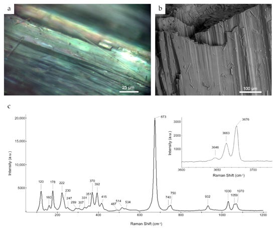 The µ-Raman spectra were collected on dark green columnar crystal aggregates (Figure 4a,b). Figure 4c shows a representative Raman spectrum in the ranges 100–1200 and 3000–4000 cm−1. The spectrum presents, in the lattice mode regions (<1200 cm−1), a very strong peak at 673 cm−1, with additional bands at 740, 750, 932, 1030, 1059, and 1070 cm−1. In the < 600 cm−1 range, the following peaks have been observed: 120, 178, 222, 370, and 392 cm−1, with weak bands at 160, 230, 247, 289, 307, 331, 351, 415, 487, 514, and 534 cm−1. The observed patterns are in accordance with the data reported for tremolite and actinolite by Rinaudo et al. [30] and Apopei and Buzgar [31], respectively.