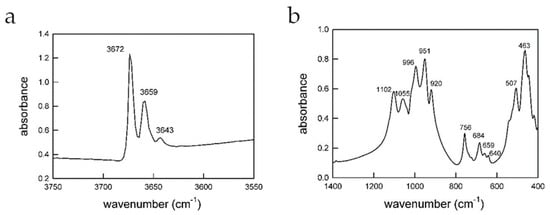 Figure 5. (a) OH-stretching and (b) lattice mode region Fourier-transform Infrared Spectroscopy (FTIR) spectrum of the tremolitic amphibole powder from Passo di Caldenno, Italy.