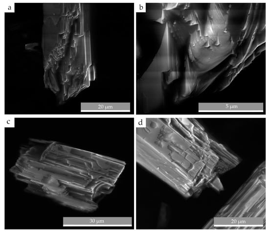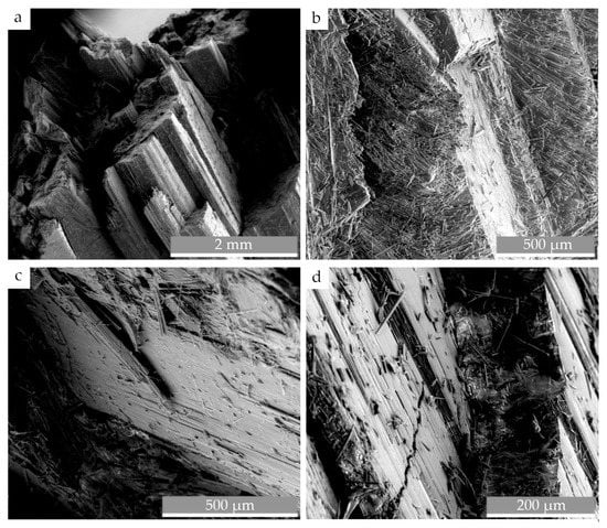 Low-magnification morphological observations of a cm-sized fragment document that fiber morphology is predominant and that fibers in parallel arrangement are the basic units that form columns (Figure 6a). These fibers appear slightly curved and randomly oriented at fracture boundaries and apices (Figure 6b,d). Even the regions in which the mineral has a bladed or prismatic shape are made of individual asbestiform fibers (Figure 6c,d).
