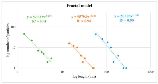 Typically, microscopically-recorded dimensional distributions fail to correctly describe the abundance of the smaller particles due to instrumental limit or observation issues [38], superposition of particles or the reciprocal screen effect, and insufficient contrast or poor resolution at a certain magnification range. Examination of all three power-law curves obtained at 102×, 103×, and 104× documents that the information regarding the lower end of the size distribution is enhanced, which results in a higher frequency of small particles compared to the one detected at lower magnifications. Inspection of the fractal model chart reveals that the observations made at 104× complement those made at lower magnifications (102×, 103×), including particles with L < 6 µm. On the other hand, the 104× data fail to describe the longest particles present in the population. The overlap between the 102× and the 103× data is larger than the overlap between the 103× and 104× data.