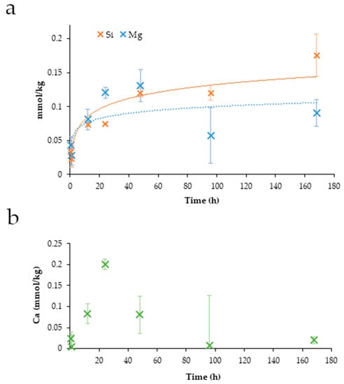 Silicon and Mg were released in a logarithmic fashion, as documented by the substantial increases in their concentrations in the solution during the first 48 h (Figure 8a). Subsequently, the concentrations of Si and Mg remained relatively constant (Figure 8a-Supplementary Materials S2). The dissolution rate of Si in the first 48 h was calculated at 1.21 × 10−12 ± 1.13 × 10−13 mol·m−2·s−1 (R2 = 0.92), which is statistically identical to the Mg dissolution rate calculated at 1.24 × 10−12 ± 2.47 × 10−13 mol·m−2·s−1 (R2 = 0.84).