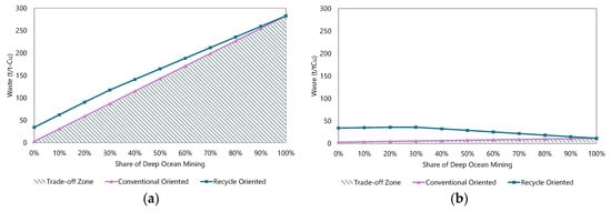 The trend for waste disposal is also similar to energy consumption, as Figure 10 shows. The trends for the Cu-Only recovery from DOM cases are similar to the previous two indicators, although the conventional-oriented and recycle-oriented curves have switched places since, when it comes to waste, conventional copper processing produces less waste domestically in Japan. The multiple metal recovery cases show different trends—in (b) which represents Cu-only recovery from recycling and multiple-metal recovery from deep ocean mining a large amount of waste is produced up until 30% deep ocean mining, which is driven by the amount of tailings from Cu-Only recycling.