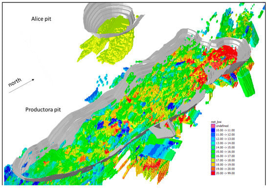 3D block model of bond work index (BWi) values for the Productora and Alice Cu-Au-Mo pits (Chile). BWi for the main Productora deposit was estimated using aluminum and potassium values as proxies. The Productora pit is approximately 2.4 km long (Reproduced with permission from King and Macdonald [20]).