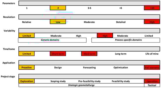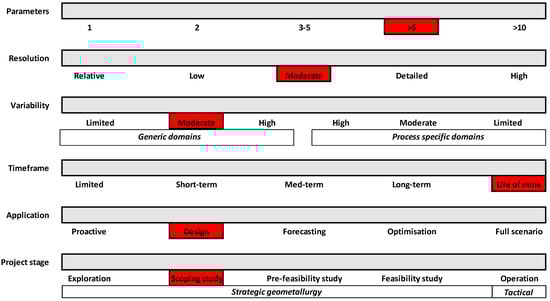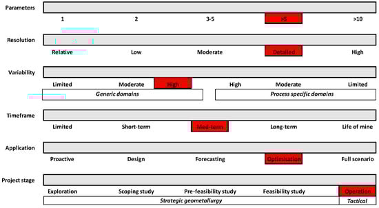 The geometallurgical framework (Figure 3, Figure 4 and Figure 5) comprises six dimensions—parameters, resolution, variability, timeframe, application, and project stage (modified from Jackson, McFarlane and Olson Hoal) [7]: