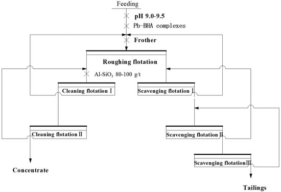 Flotation flowsheet of tungsten minerals using Pb–BHA complexes in Shizhuyuan dressing plant.