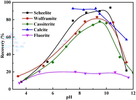 The floatability of scheelite, wolframite, cassiterite, fluorite, and calcite minerals with Pb–BHA complexes as the collector (CBHA = 1.5 × 10−4 mol/L, CPb = 2.5 × 10−4 mol/L, Cterpineol = 12.5 μL/L).