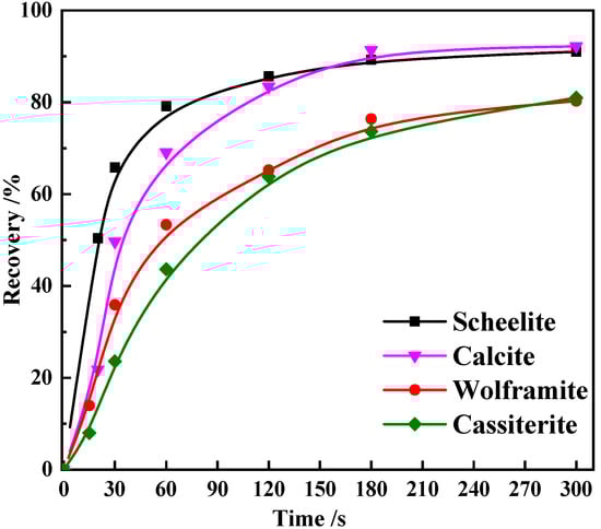 Figure 2 shows the difference of floatability among scheelite, wolframite, cassiterite, calcite, and fluorite versus pH. The results indicate that scheelite, wolframite, cassiterite, and calcite could be well collected by Pb–BHA complexes and the former three minerals show a synchronous flotation behavior with pH change, while fluorite does not. Our previous work indicated that the colloidal Pb–BHA particles were positively charged in weakly alkaline conditions, while the surface potentials of scheelite, wolframite, and cassiterite were negative [18]. Therefore, the Pb–BHA complexes could be adsorbed on the mineral surfaces by electrostatic force, leading to the similar variation trend in the recovery of scheelite, wolframite, and cassiterite minerals with increasing the pH of the flotation system. In fact, the floatability of scheelite, wolframite, cassiterite, and calcite were different from each other. The recovery of scheelite was much higher than that of wolframite and cassiterite, and the effective pH range was also larger. Scheelite, wolframite, and cassiterite could be collected concurrently using Pb–BHA complexes at pH 9 to 10. The synchronous collecting of those minerals enhanced the recovery of tungsten minerals and cassiterite from a polymetallic deposit, such as the Shizhuyuan Mine. At this condition, the calcite was also, inevitably, collected to some extent, creating some difficulties for the upgrading of the concentrate. Figure 3 shows the difference in the flotation rate of scheelite, calcite, wolframite, and cassiterite using Pb–BHA complexes. The flotation rate of wolframite and cassiterite were lower than that of scheelite. It was difficult to get the maximum recovery and best grade of different minerals by flotation simultaneously.