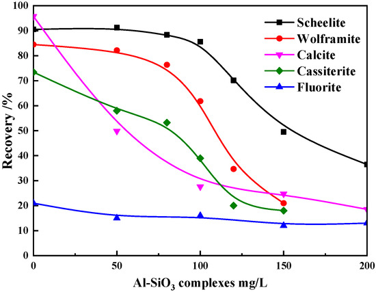 Depressants for calcite have been widely reported in previous studies [12,18,19,20], and aluminum silicate solutions (Al-SiO3) have been proven to be effective for scheelite flotation with Pb–BHA complexes as the collector [9,21,22]. Al-SiO3 was used as the depressant for the upgrading of the rougher concentrate in this research. The effect of Al-SiO3 complexes on floatability of scheelite, wolframite, cassiterite, and calcite is shown in Figure 4. It can be seen that the recovery of all the minerals was depressed at different degrees, especially at high Al-SiO3 dosage. Obviously, Al-SiO3 was not suitable to improve the upgrading of the concentrate. The inhibition effect of the depressant on upgrading is a common issue in flotation. As is well known, floatability of the minerals greatly depends on the surface properties of the minerals, such as the crystal anisotropy, which can be greatly influenced by the depressant [23,24,25,26]. Take scheelite as an example; the wettability of the (001) plane of scheelite decreased slightly, whilst increasing the dosage of Al-SiO3, while the wettability of the (112) plane decreased significantly. If the (112) plane are the main scheelite cleavage planes, the recovery of scheelite will be significantly affected by the use of Al-SiO3 in flotation [9].