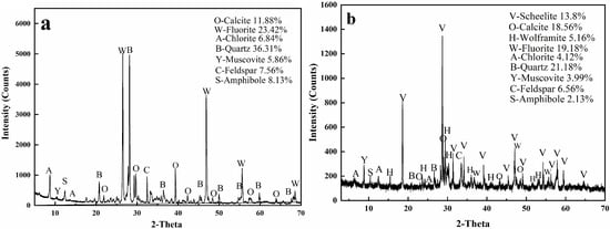 X-ray diffraction (XRD) analysis of the raw ores (a) and the rougher concentrate (b).