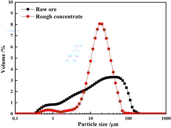 Table 4 and Figure 5 show the mineral composition and phases of the rougher concentrate. Most of the scheelite, wolframite, and cassiterite minerals were recovered with a high enrichment ratio in the roughing flotation. The selectivity of Pb–BHA complexes on calcium minerals was confirmed by the lower enrichment efficiency of calcite and fluorite. Quartz, the main gangue mineral in the rougher concentrate, was not a concern here as it can be separated easily. XRD results show that quartz, chlorite, muscovite, feldspar, and amphibole also exist in the rougher concentrate, which could be due to the entrainment of super fine particles in the foam. The existence of those minerals made it easier for the grinding process to get muddy because of their lower hardness [27,28,29], posing great challenges for the separation of them from the valuable minerals by flotation. As shown in Figure 6, D50 of the rougher concentrate was 0.021 mm, which falls into the fine particle size range, causing problems for further improvement of the concentrate quality.