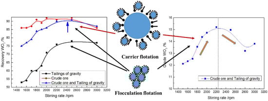 It should be noted that gravity separation was not shown to be efficient for the separation of ultrafine particles with a size of less than 10 μm. As shown in Table 5, the recovery of WO3 in the gravity separations was lower than that of the cleaning flotation. As a result of that, the collecting ability of gravity separations for the ultrafine mineral particles (<10 μm) was worse than that of flotation. Although, the optimum particle size in flotation ranges from 10 to 100 μm [31,32]. Ultrafine particles tend to be caught in streamlines created by the rising bubbles instead of attachment with the bubbles. This problem would be solved if some coarse particles could serve as the carrier for the fine particles (defined as carrier flotation) or the fine particles could aggregate with each other to form a larger particle, (defined as flocculation flotation). It has been reported that hydrophobic fine particles could aggregate with each other or a large particle to form larger particles, thereby improving the flotation recovery [33]. The mechanisms of shear-flocculation and carrier flotation are governed by physical, chemical, and geometrical variables, which have been investigated comprehensively in Subrahmanyam’s review paper [34]. After research for almost three decades, it has been widely accepted that carrier flotation and shear-flocculation can be used for pre-treatment of fine particles in flotation. Numerous studies have reported improvements in the recovery of fine particles by using this technique, with the recovery rate increased from 20% to 50% compared to the conventional flotation. Feeding the tailings of gravity separation and fine particles to the roughing flotation for a further recovery is thus proposed. The effect of the stirring rate on the shear flocculation was studied in the lab and the results are shown in Figure 7. Initially, the recovery of tungsten minerals increased significantly when increasing of the stirring rate. Where a downward trend, followed by optimum tungsten minerals recovery was observed, this was more noticeable for coarse particles. Aggregation of fine particles promotes the flotation of the gravity tailings, with the optimum recovery is said to be around 78%. When the gravity tailings were fed back to the raw ores containing coarse particles, the recovery was improved dramatically. Both carrier flotation and flocculation floatation contributed to the recovery of fine particles. Moreover, the increased tungsten recovery with the increased stirring may also result from increased probability of collision between fine particles and bubbles and the increased entrainment. As shown in Figure 7, the improved concentrate grade with the increasing of the stirring indicates that it is not due to the increased entrainment but from carrier flotation, flocculation floatation and increased ore collision between bubbles and particles. However, the decreasing of the grade may from an increasing entrainment.