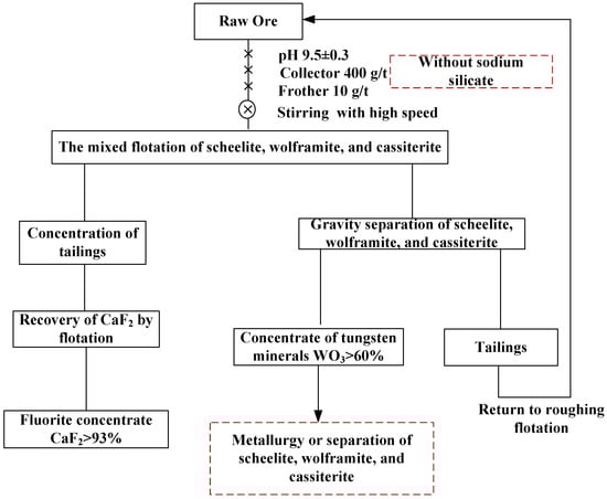 Roughing flotation using Pb–BHA complexes has been proven to be effective in the recovery of scheelite, wolframite, and cassiterite minerals, which takes full advantage of their similar floatability. It should be noted that scheelite, wolframite, and cassiterite are heavy minerals with a density of 6.1, 7.2 to 7.5, and 6.8 to 7.1 g/cm3, respectively, which are much heavier than that of most gangue minerals, such as quartz, calcite, and fluorite. With great progress in new gravity separation equipment development over the last 20 years, gravity separation is always a preferred technique [15,30]. Some advanced gravity concentrators have been developed for the gravity separation of fine mineral particles. The combination of flotation and gravity separation, which depends on the surface chemical and physical properties of the minerals, is considered to be effective in further improving the recovery of the minerals.