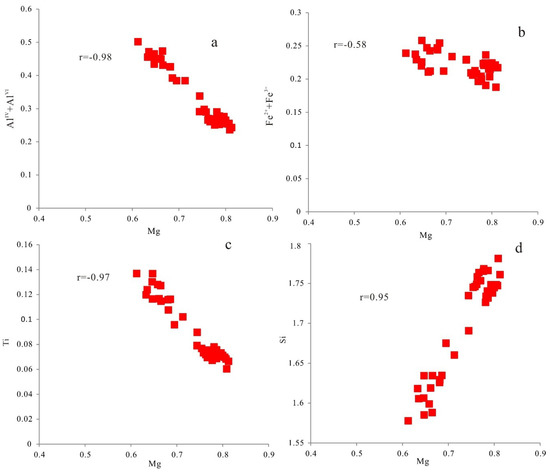 All clinopyroxenes from Well CK-2 are located in the field of the Ca-Mg-Fe pyroxene group in the Q-J diagram proposed by Morimoto et al. [63] (Figure 3a). In the conventional Wo-En-Fs diagram [63], most of the clinopyroxene plots in the diopside field, and a few clinopyroxenes fall into the fassaite field (Figure 3b). In the main cation correlation diagram (Figure 4), Al (AlIV + AlVI) and Ti have strong negative correlations with Mg (r = −0.98 and −0.97, respectively), and Si has a strong positive correlation with Mg (r = 0.95).
