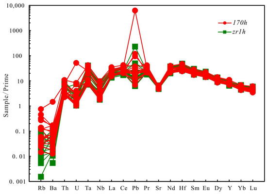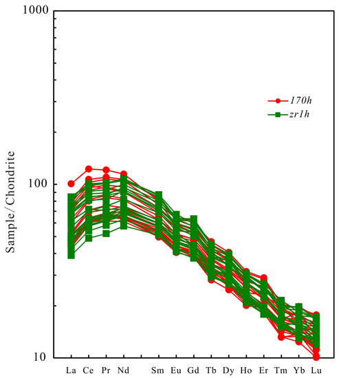 In the primitive mantle-normalized trace element spider diagrams (Figure 6), most of the samples show similar distribution patterns. One sample (170 h-15) has anomalously high Pb. As Pb exists mainly in the form of isomorphism, we suggest that this may reflect the degree of isomorphism. However, further research is required to determine this. Large-ion lithophile elements (LILE) (such as Sr and Ba) show depleted characteristics. Sr and Ba do not easily form independent minerals in magmatic rocks. These elements are mainly available in K-rich, Ca-rich minerals in the form of isomorphism. The depletion of Sr and Ba may be caused by a small amount of plagioclase, crystallized in the early stage or by magma derived from depleted mantle [65]. In addition, in the primitive mantle, normalized trace element pattern Nb/Ta fractionation is obvious. Nb shows negative anomalies, and Ta has significant positive anomalies, which is consistent with their distribution coefficients between clinopyroxene and melt, indicating that the main cause of their fractionation is the crystallization differentiation of clinopyroxene.