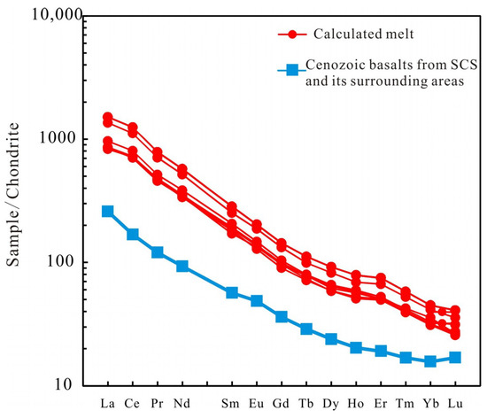 Trace element abundances in clinopyroxene reflect the trace element contents of the parental magma when the mineral grains segregate, which provides some clue as to the chemical composition of the parental magma [35,67]. REE exist mainly in the form of isomorphism in pyroxene. The clinopyroxenes from Well CK-2 belong to Ca-Mg-Fe series, which are beneficial to the isomorphism of REE [69]. Isomorphic replacement among cations in pyroxenes is a very common but complicated phenomenon. The change in elemental content reflects the difference in the degree of isomorphism, which may be due to the fractional crystallization. The clinopyroxene chondrite-normalized REE patterns and primitive mantle-normalized trace element patterns of the clinopyroxenites from Well CK-2 all show a similar LREE enrichment, depletion in Sr, Ba and Ta, and enrichment in Nb, suggesting that these clinopyroxenes are all derived from magma, with the same trace element characteristics. To further study the chemical composition of the parental magma, we calculated the REE contents of the hypothetical parental melt in clinopyroxene using the clinopyroxene/melt partition coefficient (Table S5) [34,64]. In the calculated chondrite-normalized REE diagram (Figure 8), all data for the calculated melts show a very strong enrichment in LREE. The calculated melt REE distribution patterns are similar to those of the volcanic rocks from the SCS and its surrounding areas [3,4,7,8,9,10,15,17,36,55,79,80] and to the typical intraplate oceanic island basalts (OIB) [81].