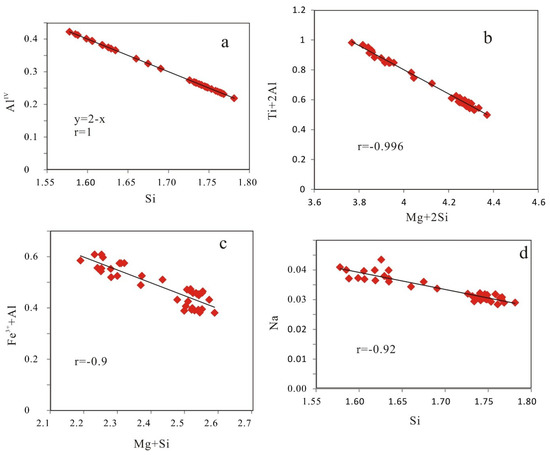In addition to Al3+, the octahedral position still requires additional cations to compensate for the electric charge imbalance caused by the replacement of Si by AlIV, such as Fe3+ and Ti4+. However, previous studies have shown that Fe3+ preferentially entered octahedral sites rather than Ti, and only a small amount of Ti in the octahedra is used to compensate for the excess negative charge caused by the replacement of Si by AlIV [19,63]. The corresponding alternative reaction formula for the replacement of Mg by Ti is: M1Mg + T2Si = M1Ti + T2Al3. The (Mg + 2Si) has a good correlation with (Ti + T2Al) (r = −0.996) (Figure 9b), although most of the Ti is independent of the equilibrium charge and enters the octahedral sites to form titanaugite (NaMg0.5Ti0.5Si2O6) by the alternative equation Ca + Mg = Na + Mg0.5Ti0.5 [19,63]. Thus, we conclude that the electric charge imbalance caused by the replacement of Si by Al is mainly compensated by Fe3+. The corresponding alternative reaction formula is: M1Mg + TSi = M1Fe3+ + TAlIV, forming calcium iron aluminum pyroxene (CaFeAlSiO6). In Figure 9c, (Mg + Si) and (Fe3+ + Al) are shown to have a good negative linear relationship (r = −0.90), implying that the octahedral bound, Fe3+, entered the pyroxene crystal structure and replaced Mg2+ to compensate for the electric charge imbalance caused by the replacement of AlIV by Si. Furthermore, in Figure 9d, Na is shown to have a significant negative correlation with Si (r = −0.92), suggesting that Na and Fe3+ participate in the replacement reaction during the late stage of the formation of clinopyroxene (Ca + Mg = Na + Fe3+). The contents of Ti and Fe3+ control the content of Na in clinopyroxene.