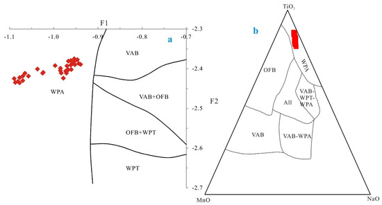 Figure 10. Tectonic discrimination diagram, proposed by Nisbet and Pearce [27]. (a) F1 vs. F2 tectonic discrimination diagrams; (b) TiO2-MnO-Na2O tectonic discrimination diagram. WPT: within-plate tholeiitic basalt; WPA: within-plate alkali basalt; VAB: volcanic arc basalt; and OFB: ocean floor basalt.