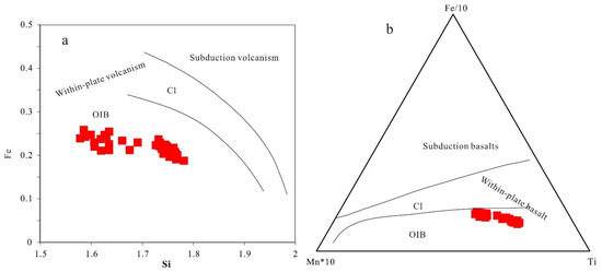 Figure 11. Tectonic discrimination diagrams, proposed by Aparicio [30]. (a) Fe vs. Si tectonic discrimination diagrams; (b) Fe/10-Ti-Mn × 10 tectonic discrimination diagram for clinopyroxene. CI: alkaline volcanism thinned continental crust, OIB oceanic island basalt.