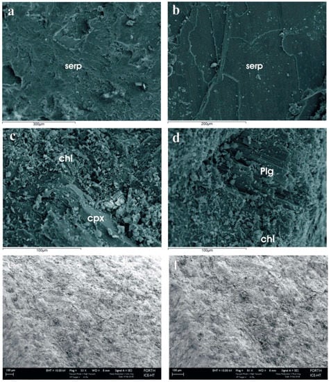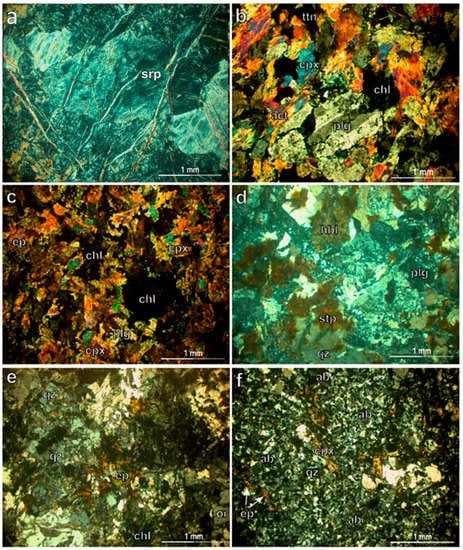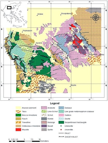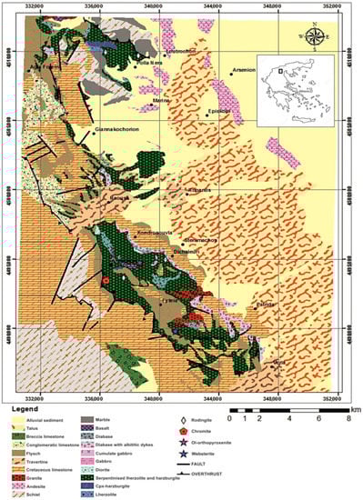- Giannakopoulou, P.P.; Petrounias, P.; Rogkala, A.; Tsikouras, B.; Stamatis, P.M.; Pomonis, P.; Hatzipanagiotou, K. The influence of the mineralogical composition of ultramafic rocks on their engineering performance: A case study from the Veria-Naousa and Gerania ophiolite complexes (Greece). Geosciences 2018, 8, 251. [Google Scholar] [CrossRef]