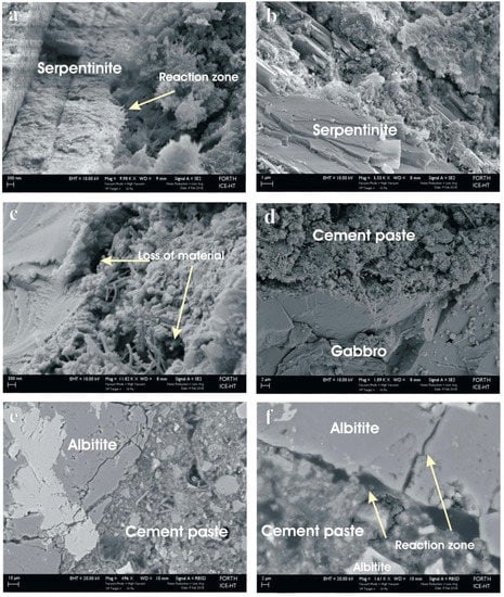 - Strength and resistance to abrasion and attrition of aggregates was a critical factor that largely determined the quality of the concretes positively. Microroughness was a result of differential hardness of juxtaposed minerals on the surface of the particles and largely affected the bonding between the particles and the cement paste for each lithotype. Smooth serpentine had a negative influence; however, small amounts of soft secondary minerals juxtaposed with hard primary phases had a positive effect on the bonding with the cement paste.