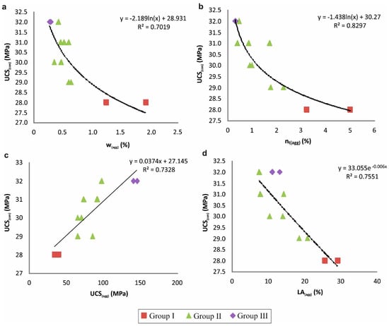 | Samples Grading | Aggregate | Lithotype | Porosity (%) | Moisture Content (%) | Los Angeles (%) | Compressive Strength (MPa) * (N = 6) |