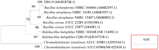 B. licheniformis DB1-9 bacteria have been cultivated by Associate Professor Huaxiao Yan in the Department of Bioengineering, Shandong University of Science and Technology, and been preserved in a refrigerator at −20 °C. According to published methods [29,36,48], the total DNA of B. licheniformis DB1-9 bacteria was extracted and used as a template to amplify the 16S rDNA, and then the 16S rDNA was sequenced by Shanghai Sangon Biotech Co., Ltd (Shanghai, China). The complete DNA sequences were obtained through fragment assembly using DNAMAN 8.0 software, and uploaded to GenBank. Basic Local Alignment Search Tool (BLAST) was used to compare the nucleotide homology between the 16S rDNA of B. licheniformis DB1-9 bacteria and those of other bacteria. The phylogenetic tree of B. licheniformis DB1-9 bacteria was constructed by the neighbor-joining method using MEGA 7.0 software [24].