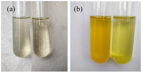 Ammonia test of B. licheniformis DB1-9 bacteria cultivated for 30 h. (a,b) The control group is the culture medium without bacteria (right); the experimental group is inoculated with bacteria (left). (a) before adding Nessler’s reagent, (b) after adding Nessler’s reagent.