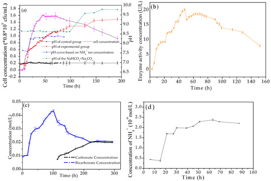Figure 4a shows the growth curve of B. licheniformis DB1-9 bacteria and the pH curves. It can be seen from the growth curve that 0–8 h is the delay period or lag time; the logarithmic growth period is from 8 to 46 h. The stable period is in a time range of 46–74 h; the cell concentration has remained almost constant because the birth rate has equaled the mortality rate. The decline period is from 74–192 h. In the delay period, pH increases from 6.92 to 7.06. During the logarithmic growth period, the pH sharply increases from 7.06 to 8.25. In the stable period, the pH increases from 8.25 to 8.6. The most striking thing to notice is that the pH continues to rise from 8.6 to 9.27 in the decline period. An ammonia test was performed in the time range of 24–48 h (Figure 3) and the result shows DB1-9 bacteria can release ammonia. The ammonia released in the logarithmic growth period is the main reason for the pH increase from 7.06 to 8.25. NH4+ ion concentration increases from 0 to 2.25 × 10−6 mol/L in the time range of 0–50 h, and remains almost constant from then on (Figure 4d). The pH curve based on the NH4+ ion concentration shows that the ammonia released by B. licheniformis is able to increase in pH to about 8.25 (Figure 4a); this also reveals that factors other than ammonia can also increase pH. The pH values of the control group are almost constant at 7.0, significantly different from those of the experimental group (p < 0.01).