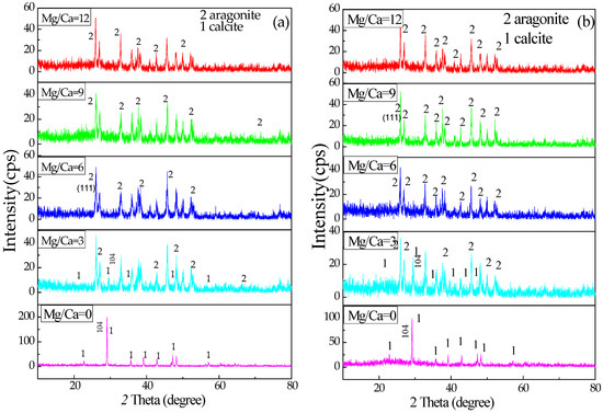 XRD analyses of the minerals induced by B. licheniformis. (a) The minerals cultivated for 12 d; (b) the minerals cultivated for 24 days.