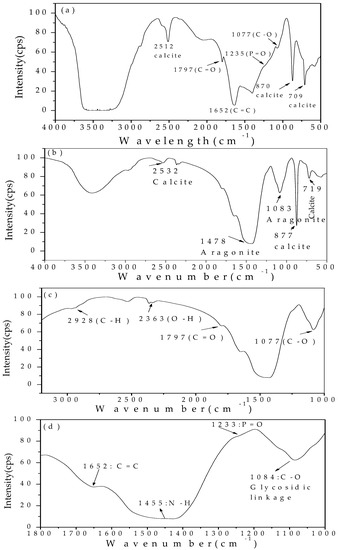 The sample preparation work followed the procedure of Tian et al. and Wang et al. [71,72]. The characteristic peaks of the minerals and organic functional groups can be obtained from Figure 7. The characteristic peaks of calcite are 712, 875, 1421, and 2514 cm−1, and those of aragonite are at 710, 856, 1082, and 1475 cm−1 [40]. It can be seen from Figure 7a that the peaks at 709, 870, and 2512 cm−1 are the characteristic peaks of calcite; some organic functional groups, such as C–O (1077 cm−1), P=O (1235 cm−1), C=C (1652 cm−1), and C=O (1797 cm−1) are also present. It can be seen from Figure 7b that the peaks at 719, 877, and 2532 cm−1, are the characteristic peaks of calcite, and the peaks at 1083 and 1478 cm−1 prove the existence of aragonite, consistent with the results of XRD analyses. Besides the characteristic peaks of these minerals induced by B. licheniformis, there are also some peaks showing other organic functional groups present in/on the minerals, such as C–H methylene vibrational band (2925 cm−1), O–H vibrational band (2363 cm−1), C=O vibrational band (1797 cm−1), and C–O vibrational band (1077 cm−1), shown in Figure 7c, and C=C, N–H, P=O, and C–O (glycosidic linkage) vibrational band at 1652, 1455, 1233, and 1084 cm−1, shown in Figure 7d, indicating that there was a close relationship between the organic functional groups and B. licheniformis. As to which kind of specific organic functional group affects calcite and aragonite, further exploration is needed.