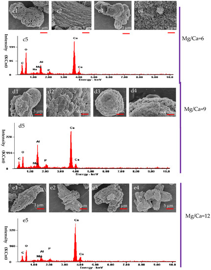 SEM and EDS analyses (a5, b5, c5, d5, and e5) of the minerals in the experimental group after 24 days of cultivation. Mg/Ca molar ratio of 0 (a1–a4); Mg/Ca molar ratio of 3 (b1–b4); Mg/Ca molar ratio of 6 (c1–c4); Mg/Ca molar ratio of 9 (d1–d4); Mg/Ca molar ratio of 12 (e1–e4).
