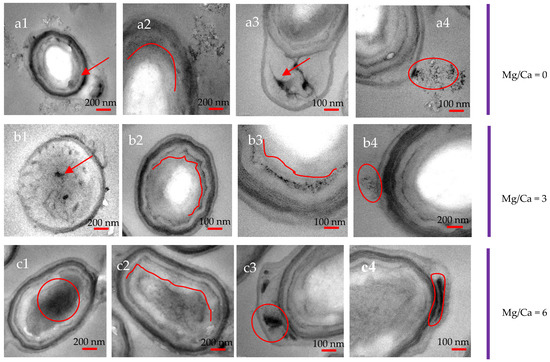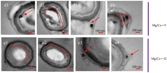 TEM analyses of ultrathin slices of B. licheniformis cultivated for 24 d. The intracellular and extracellular granules are marked with red arrows. Mg/Ca molar ratio of 0 (a1–a4): intracellular granules (a1,a2) and extracellular granules (a3,a4); Mg/Ca molar ratio of 3 (b1–b4): intracellular granules (b1–b3) and extracellular granules (b4); Mg/Ca molar ratio of 6 (c1–c4): intracellular granules (c1,c2) and extracellular granules (c3,c4); Mg/Ca molar ratio of 9 (d1–d4): intracellular granules (d1,d2) and extracellular granules (d3,d4); Mg/Ca molar ratio of 12 (e1–e4): intracellular granules (e1,e2) and extracellular granules (e3,e4).