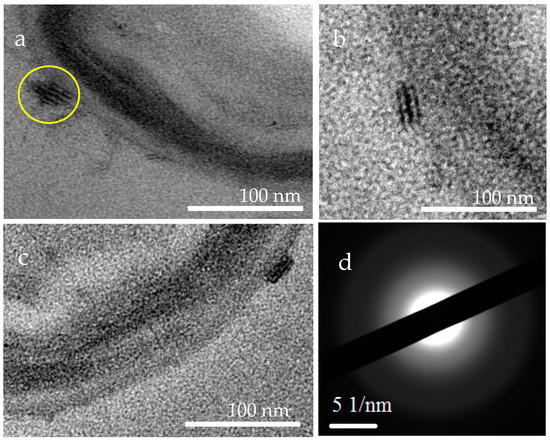 The dark clumps composed of alternating light and dark bands within the EPS of B. licheniformis analyzed by HRTEM and SAED. (a–c) images of the dark clumps analyzed by HRTEM, (d) SAED image of the dark clump marked by the yellow circle in (a).