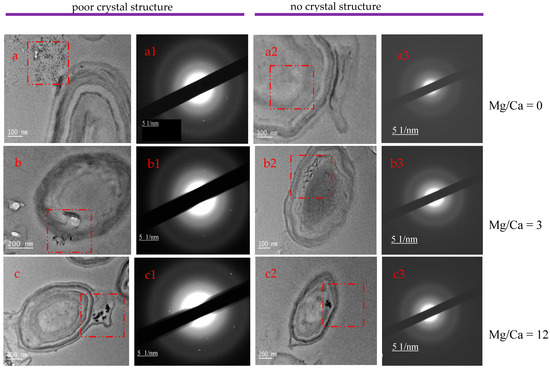In order to investigate the crystal structure of the dark granular or elongate material, SAED analyses were performed. A small number of diffraction spots were obtained in the SAED images (Figure 11(a1,b1,c1)), indicating that the extracellular dark material (Figure 11a–c) has a poor crystal structure. Intracellular dark granular areas (Figure 11(a2,b2,c2)) have no crystal structure, due to the fact that there are no diffraction spots in the SAED images (Figure 11(a3,b3,c3)). Some researchers have considered why amorphous material remains stable inside the cell since in general, and an amorphous mineral is unstable and will develop into a more stable form with a better crystal structure, such as amorphous calcium carbonate (ACC) changing into calcite. The mechanism of keeping the amorphous matter stable inside a cell has been related to the intracellular organic molecules. The dark clumps (Figure 10a–c), composed of alternating light and dark bands within the EPS of the cell, have been examined further by SAED, and the results show that they still have no crystal structure (Figure 10d). Although intracellular and extracellular dark granular and linear material can be observed, and the extracellular dark matter has a poor crystal structure and the intracellular granular material has no crystal structure, the elemental composition still cannot be determined; thus, the next objective in this research is to investigate if the dark granular or linear material contains Ca and Mg elements.