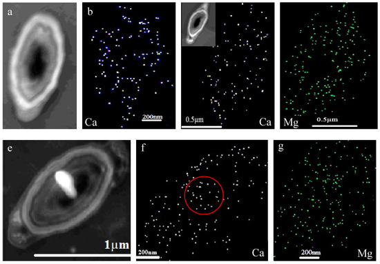 Figure 12c,d show the distribution of Ca and Mg within/on B. licheniformis at a Mg/Ca molar ratio of 3, also revealing the same rule that the concentrations of Ca and Mg decrease from outside to inside the cell, that is to say, the transport mode of Ca2+ and Mg2+ ions was diffusion, due to the fact that the metal ions were transferred along the concentration gradient, namely, from high to low concentration. The light area inside the cell (shown in Figure 12e) also contains Ca and Mg (Figure 12f,g). Figure 12f,g show the distribution of Ca and Mg within/on B. licheniformis at a Mg/Ca molar ratio of 12. It can be observed that the concentration of Mg is higher than that at a Mg/Ca molar ratio of 3, suggesting that more and more Mg2+ ions could enter inside the cell by diffusion, with the increase of Mg2+ ion concentration. These results also show that the ability of B. licheniformis to prevent ions from entering the cell is limited. As is well known, Ca2+ and Mg2+ ions are cofactors of many enzymes in the cell since, without these ions, the enzymes will lose their activity, while, if the concentrations of Ca2+ and Mg2+ ions are too high, they will have an adverse effect on the cell. In order to protect themselves, the only way is for solid amorphous matter to be formed, using the Ca2+ and Mg2+ ions transferred from the outside to the inside of the cell, along the concentration grade. This protection mechanism has already been discussed by scientists studying intracellular biomineralization. The amorphous dark granular areas inside the cell are maybe part of this protection mechanism.