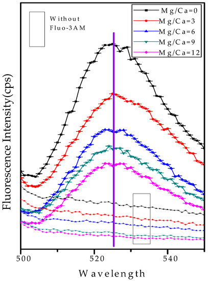 In order to study the changes in intracellular Ca2+ concentration, a fluorescence intensity experiment has been performed. Figure 13 shows that there are no fluorescence intensities of bacteria at different Mg/Ca molar ratios without adding the Fluo-3 AM reagent, indicating that the bacteria themselves do not emit the fluorescence. After adding the Fluo-3 AM reagent, the fluorescence intensities of intracellular Ca2+ ions decrease with the increase in Mg/Ca molar ratio, further demonstrating that Ca2+ ions can enter the cell. The concentration of Ca2+ in the medium is higher than that inside the cell, thus, Ca2+ could be transferred from outside to inside the cell by diffusion. The fluorescence intensities at 525 nm were analyzed by SPSS 21 software, and the results show that there was an extremely significant difference in the fluorescence intensity, not only between the experimental and control group (p < 0.01), but also at different Mg/Ca molar ratio in the experimental group (p < 0.01). Changes in the concentration of intracellular Mg2+ ions in cells will be studied later.