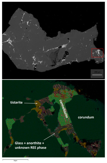 (Top) SEM-BSE image of carmeltazite (in corundum); scale bar is 200 μm; and (Bottom) phase map of the region highlighted in the top image with a red dashed rectangle (scale bar is 50 μm).
