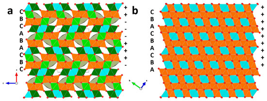 The crystal structure of carmeltazite (Figure 4) is close to a defective spinel structure. The M9O12 stoichiometry of a spinel becomes M7O11 as one oxygen and two cations are lost. Nevertheless, the stacking of oxygen layers is not a cubic-close-packing yielding a standard ABCABC sequence along the cubic direction [111]. In carmeltazite, the sequence is hexagonal (the (hcc)2 of Tillmanns et al. [8]), i.e., ABACBC along [100]. Therefore, the two central layers are shifted and that changes the coordination of some atoms.