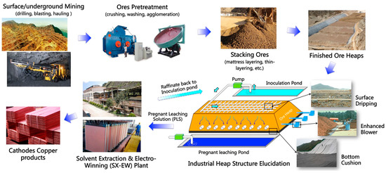 Lower-grade extractions and increasing global demand are noticeable barriers to valuable metal extraction [8]. As an efficient recycling approach used for low-grade minerals, complex polymetallic resource, and solid ore waste [9,10], bioheap leaching and biodump leaching have been broadly applied, having potential given the exhaustion of high-quality copper mines. These approaches have been extensively researched and utilized in China, Chile, Spain, and South Africa [11,12,13,14,15]. Bioleaching drives conventional mining revolution to extract minerals from mineral wastes and ore deposits buried deep in the ground [16,17,18]. The basic and simplified process of bioheap leaching is shown in Figure 1.