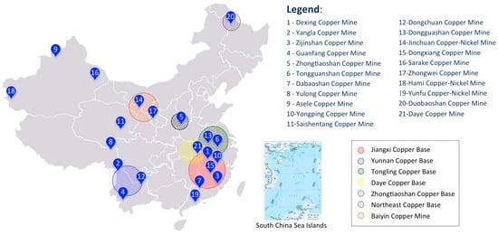 China is one of the largest mining countries in the world, with more than 240 mine sites [57]. China’s copper deposits are mainly divided into porphyry-type (41%), skarn-type (27%), marine volcanic-type (9.24%), copper-nickel (Cu-Ni) sulfide-type (5.67%) and others (17.09%) [58]. For complex reasons, the majority of the condition of conventional surface and underground mining for copper minerals in China are not very suitable, unlike South Africa and Australia. Chinese copper mines tend to be lower-grade, having an average Cu content of around 0.87%, which is hard to extract using conventional mineral processing. In terms of size, the medium-scale (9%) and small-scale (88%) copper mines dominate, compared to the large-scale mines (3%). Due to the limitations in the metal quantity and quality, the application of conventional mining methods tends to be impossible. Chinese copper mines have complex mineral compositions with associated minerals like nickel, gold, and sulfur, among others. Around 76% associated-gold, 32.5% associated-silver, and 76% sulfur come from copper mines. The mines contain heterogeneous dissemination-type ores. Porphyry copper deposits and skarn copper deposits dominate. China has several copper deposits and production bases (Figure 2). The copper bioleaching bases are concentrated in the central and eastern regions, especially in the southeast, due to the suitable mineral composition. Details of each base are: