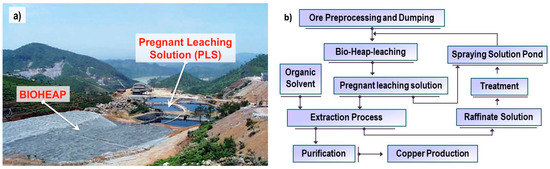 Zijinshan Copper Mine is the largest bio-heap leaching case study, playing a key role in the research and application of copper bioleaching in China. It is located in Shanghang City, Fujian Province. The ZCM has the largest chalcocite deposit, with about 13.9 million tons of low-grade copper sulfide ore (Cu 0.38%). An overview and the flowchart of bioleaching system are shown in Figure 3 [86]. Due to lower recovery and high cost of traditional mining methods, the ZCM has been extracting copper using bioheap leaching since the 1998. A Solvent Extraction/Electro-Winning (SX-EW) commercial bioleaching plant, designed by China ENFI Engineering Corporation was constructed in 2000 and has been operational since the 2005 with a capacity of 20,000 t/a at a copper extraction rate of 80% [87,88,89].