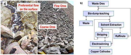 Compared to bioheap leaching, lacking a pad and higher boulder yield are considered pivotal challenges of biodump leaching. A lower bacteria population and WRD’s intrinsic permeability are thought as bottlenecks to better extraction in DCM, as Figure 4 shows [101]. Due to heap’s lower permeability in the DCM, seepage phenomenon, like preferential flow, was founded based on CT technology, and its effects on extraction and surface morphology were pinpointed [102]. Mutiphysics interactions were researched. Moreover, the WRD’s stability is threatened by certain factors, such as particle size, surface erosion, and bioleaching mechanism, creating a landslide threat. As a notable landmark with great significance, biodump leaching in the DCM confirmed the leachability and potential commercial profits of WRD with lower intrinsic permeability.