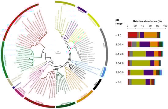 Prokaryotic microorganisms in AMD ecosystems insides acid solution, biofilms, and sediments and its distribution with different pH value ranges [134]. Reproduced with permission from Chen, L.X., Current Opinion in Biotechnology, Microbial communities, processes and function in acid mine drainage ecosystems; published by Elsevier, 2012.