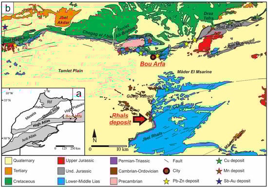 (a) Simplified geologic map of parts of Morocco and location of Bou Arfa; (b) Synthetic geologic map of the Bou Arfa region generalized according to the ages of units and showing the location of the Jbel Rhals ore deposit (modified from [4]).