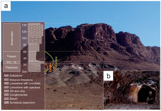 (a) Field view of Jbel Rhals and stratigraphic log of the observed units (modified after [3]); (b) mining gallery showing Fe-Mn mineralization.