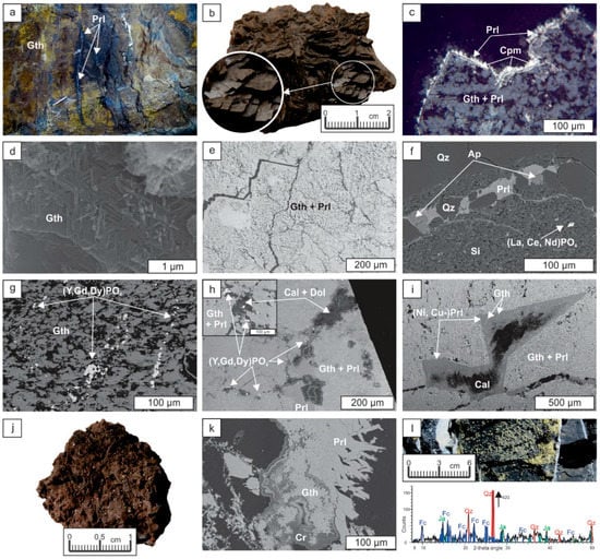 Fe-Mn mineralization (c: reflected light photomicrograph; d–i,k: SEM photomicrographs, in backscattered electrons mode). (a) Pyrolusite (Prl) veins in iridescent goethite (Gth); (b) rhombohedral goethite; (c) acicular pyrolusite (Prl) and cryptomelane (Cpm) at the surface of goethite (Gth) intermixed with pyrolusite (Prl); (d) goethite (Gth) crystallites highlighting the pseudomorphose of siderite along cleavages; (e) cleavages of primary minerals preserved in the intermixed goethite (Gth) and pyrolusite (Prl); (f) apatite (Ap) and quartz (Qz) in a pyrolusite (Prl) vein cutting quartz (Qz) and unidentified silicates (Si), where a (La, Ce, Nd) phosphate is observed; (g) accumulation of (Y, Gd, Dy)PO4, in goethite (Gth); (h) (Y, Gd, Dy)PO4 on the edges of calcite (Cal) and dolomite (Dol) crystals, close to pyrolusite (Prl), in the intermixed goethite (Gth) and pyrolusite (Prl); (i) calcite (Cal) observed as triangle-shaped sections of rhombohedrons, undergoing weathering and replacement by Ni- and Cu-rich pyrolusite ((Ni, Cu-)Prl) and goethite (Gth), in the intermixed goethite (Gth) and pyrolusite (Prl); (j) goethite with collomorph structures; (k) pyrolusite (Prl), goethite (Gth), and cryptomelane (Cr) growing in a cavity and forming collomorph structures; (l) yellowish jarosite (Ja) and ferricopiapite (Fc) (with X-Ray diffraction pattern) coating the Paleozoic schisteous host rock.