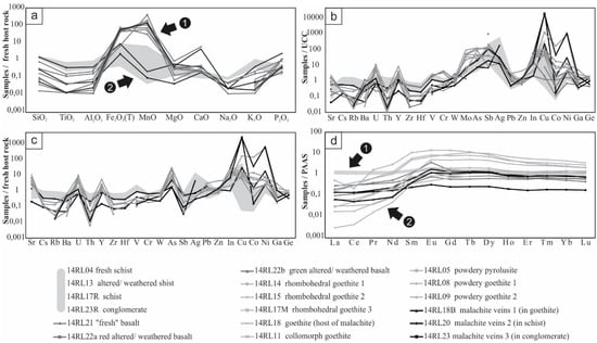 Many values are below the detection limit (e.g., Ta, Nb, Tl, Bi). Host rocks and basalts have higher amounts of Zr and Th than mineralized samples, but are depleted in U, Y, Mo, As, In, Cu, Co., and Ni. The fresh schist, the altered/weathered schist, and gangue minerals of the Fe-Mn mineralization display the highest contents in Rb (respectively 179, 117, and 162 ppm), Nb (respectively 17.3, 7.5, and 9.3 ppm), and Zr (respectively 152, 84, and 101 ppm). Goethite hosting malachite veins is very rich in Cu, Co and Ni (respectively 2.92%, 0.268%, 3.48%), but in this particular case, the enrichment is considered as contamination from the hosted veins during sampling (Figure 5d).