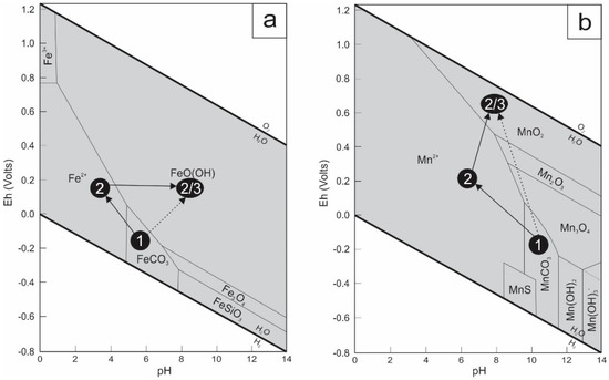 (a) Eh–pH diagram for a part of the Fe-C-Si-O-H system, showing the stability fields of selected iron minerals at 25 °C and 1 atmosphere (modified after [47]). Siderite (1) may be directly weathered in goethite (2), or it may be leached first, leading to the presence of aqueous Fe2+ (2) and later to the precipitation of goethite (3); (b) Eh–pH diagram for a part of the Mn-C-S-O-H system showing the stability fields of selected manganese minerals at 25 °C and 1 atmosphere (modified after [47]). Rhodochrosite may be directly weathered in pyrolusite (2), or is firstly leached, leading to the presence of aqueous Mn2+ (2) and later to the precipitation of pyrolusite (3).