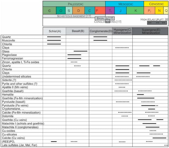 Paragenese of Jbel Rhals rocks and mineralizations, in relation to the evolution of the geological/geodynamical context: (A) formation of the Paleozoic schisteous basement; (B) Permo-Triasic basalts flow; (C) alteration of the host rocks, basalts, and formation of a hydrothermal ore; (D) Triassic conglomerates; (E) weathering probably related to the High Atlas Uplift. Relative ages of the formations are from [4], and of the High Atlas uplift from [6].