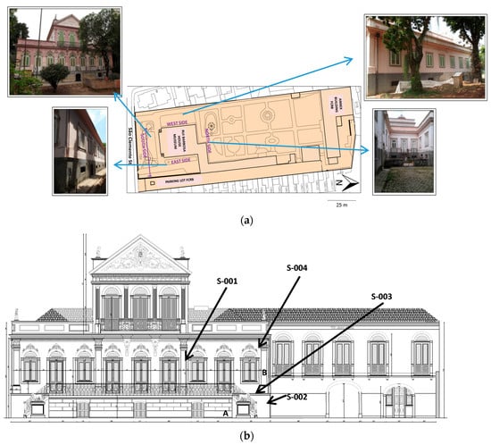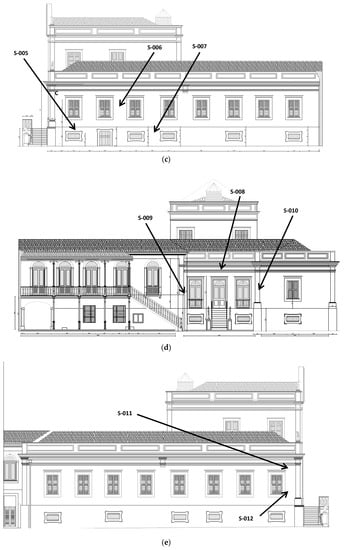 (a) Plant of Rui Barbosa House Museum; (b) South side, (c) East side, (d) North side, and (e) West side.